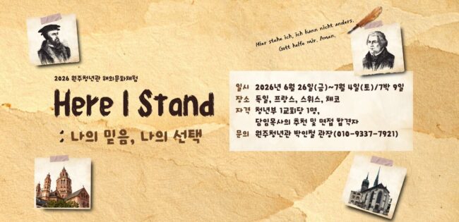 하나님의 평강이 언제나 함께하시기를 기원합니다. 그동안의 관심과 기도로 원주청년관은 청년들을 위해 주어진 사역을 은혜 가운데 감당하고 있습니다. 2026에도 많은 기도와 관심을 부탁드립니다. 다름이 아니오라 청년관에서는 2026년 해외문화체험여행에 함께할 참가자를 모집합니다. 아래 사항과 첨부된 서류를 참조하셔서, 이에 뜻을 가진 청년들이 자신의 미래를 위하여 참가할 수 있도록 협력해 주시기 바랍니다. 신청서 다운로드 : 2026 해외문화체험여행 신청서