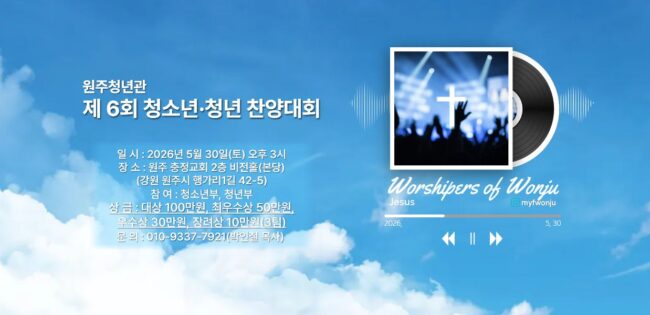 원주청년관에서 지역교회 청소년, 청년들을 대상으로 찬양대회를 매년 개최하고 있습니다. 올해로 6번째를 맞이하였습니다. 지역교회의 청소년 청년들이 주님을 찬양하며, 친교와 교제를 나눌 수 있도록 귀한 축제에 많은 참여 부탁드립니다. 제6회 청소년 청년 찬양대회 신청서 2026 (누르면 신청서 파일이 다운로드됩니다)
