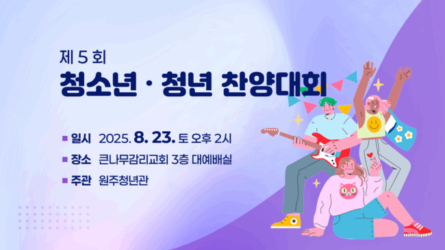 제5회 청소년 청년 찬양대회 일 시 : 2025년 8월 23일(토) 오후 2시 장 소 : 큰나무감리교회 3층 대예배실 대 상 : 원주 지역교회 중고등부, 청년부 주최,주관 : 원주청년관 접수 및 접수처 : 참가신청서 양식에 따라 기입하여 아래 이메일로 8월 11일(월)까지 접수 메일 : luyjin@hanmail.net 6. 참가비 : 5만원(교회이름으로 입금), 참가팀 선착순 12팀…